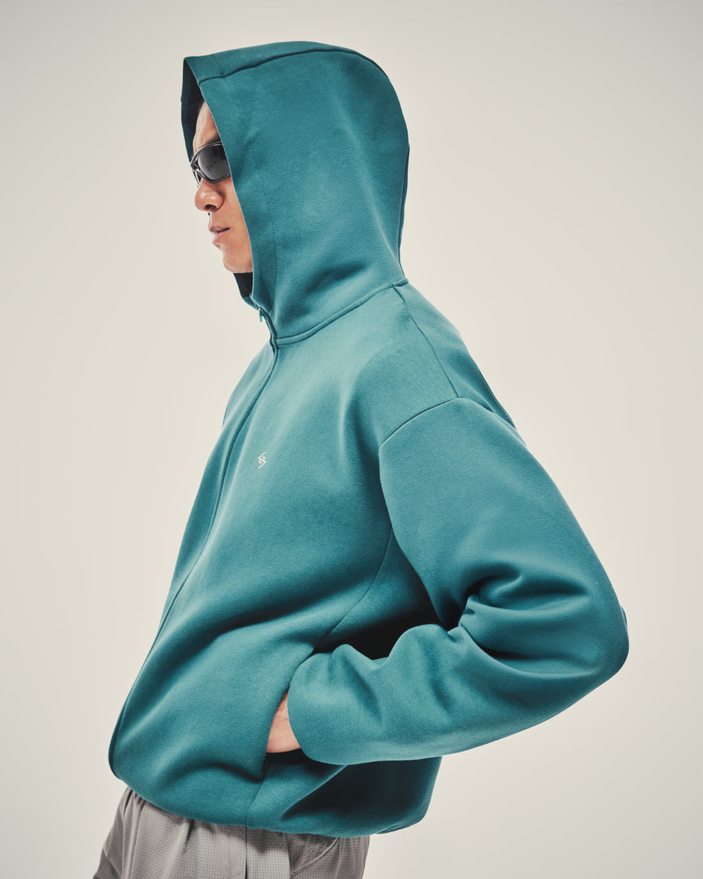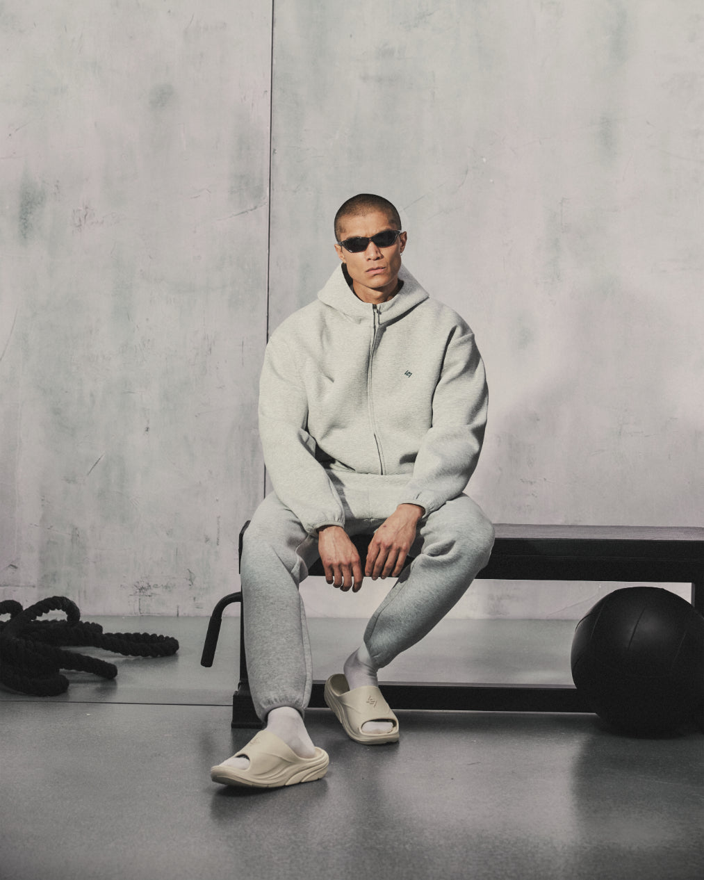 The Hoodie and Sweatpant are both built from 460GSM Spacer Fabric, a 3D knitted construction with a monofilament middle layer that allows air to circulate freely while retaining warmth.