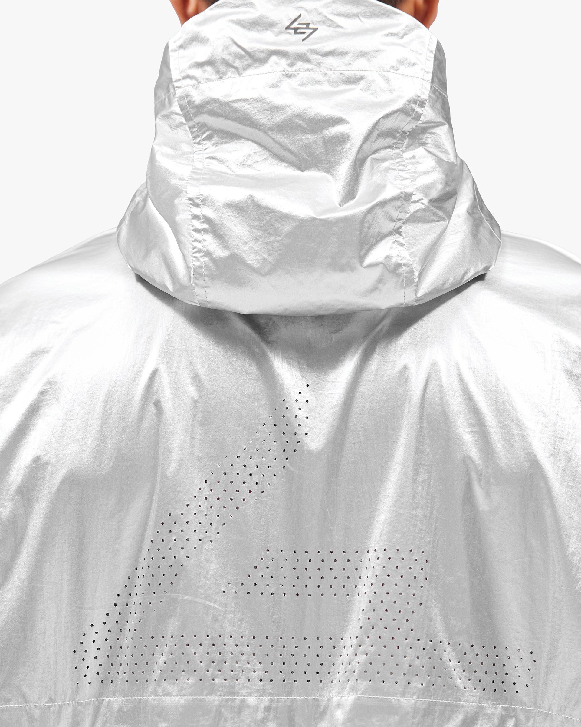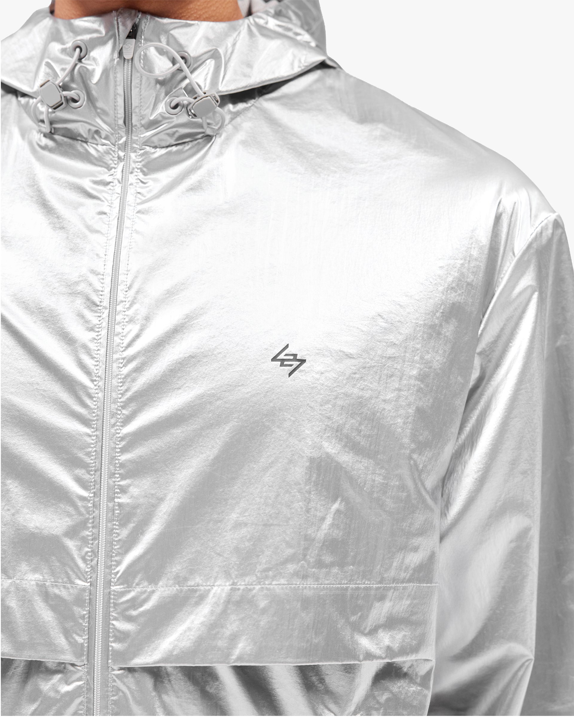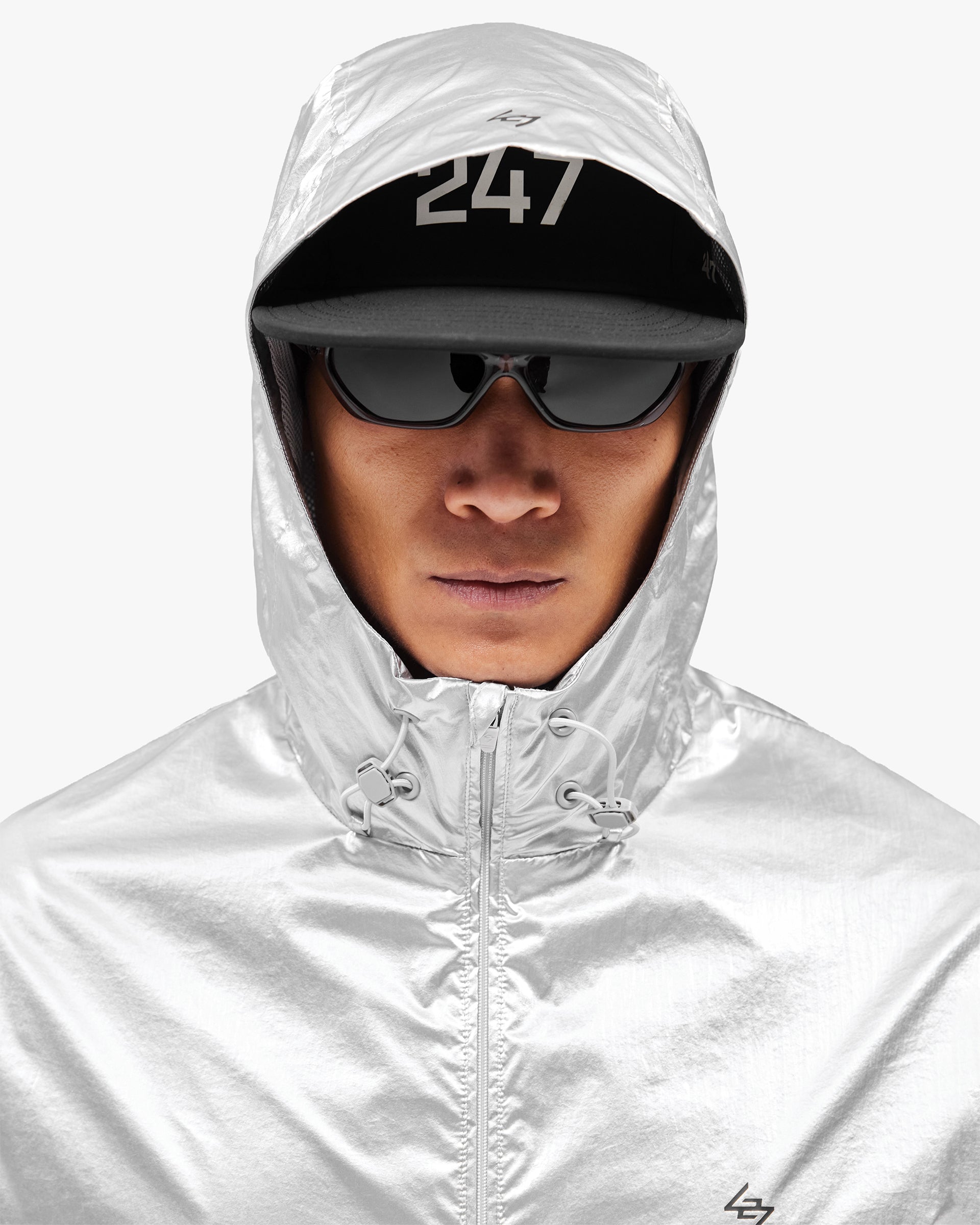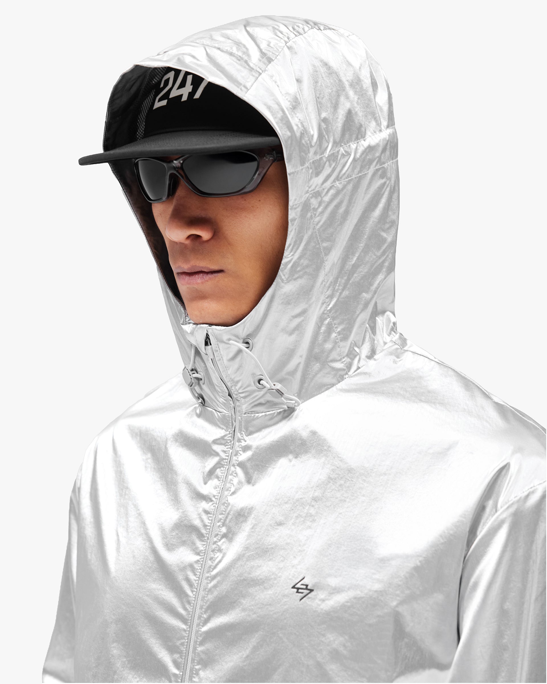 Introducing the 247 Foil Jacket in Silver. Built from PU coated foil fabric with a half mesh lining, this statement layer headlines the SS26 collection. Hood, neck and hem adjusters deliver a tailored fit, whilst front and back working storm flaps provide protection in variable conditions. Underarm eyelets offer ventilation when the pace picks up, with 3D peck construction and a mesh windproof insert completing the technical build.