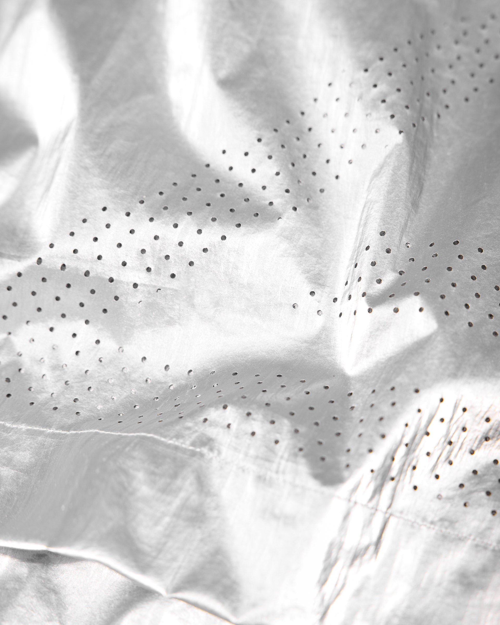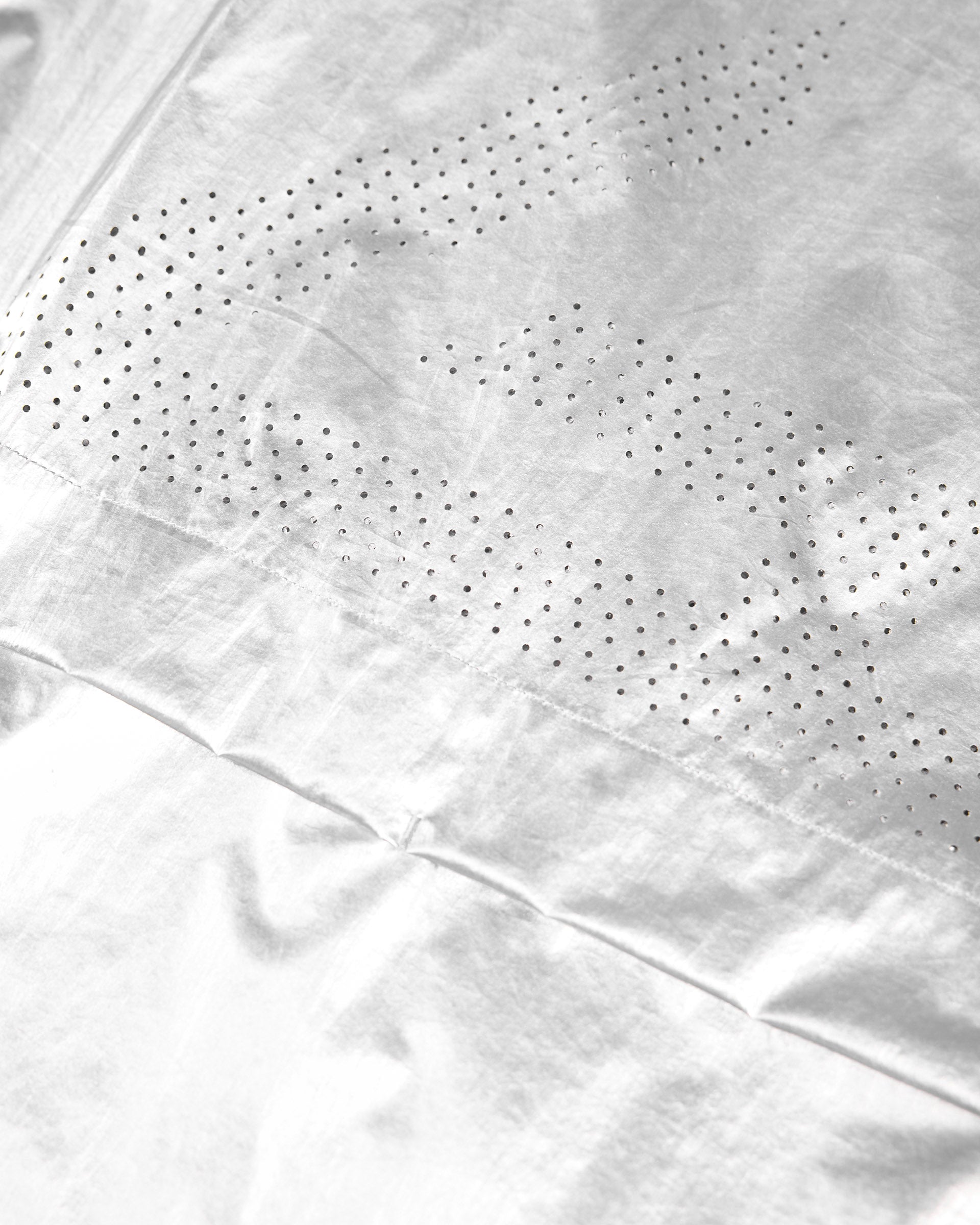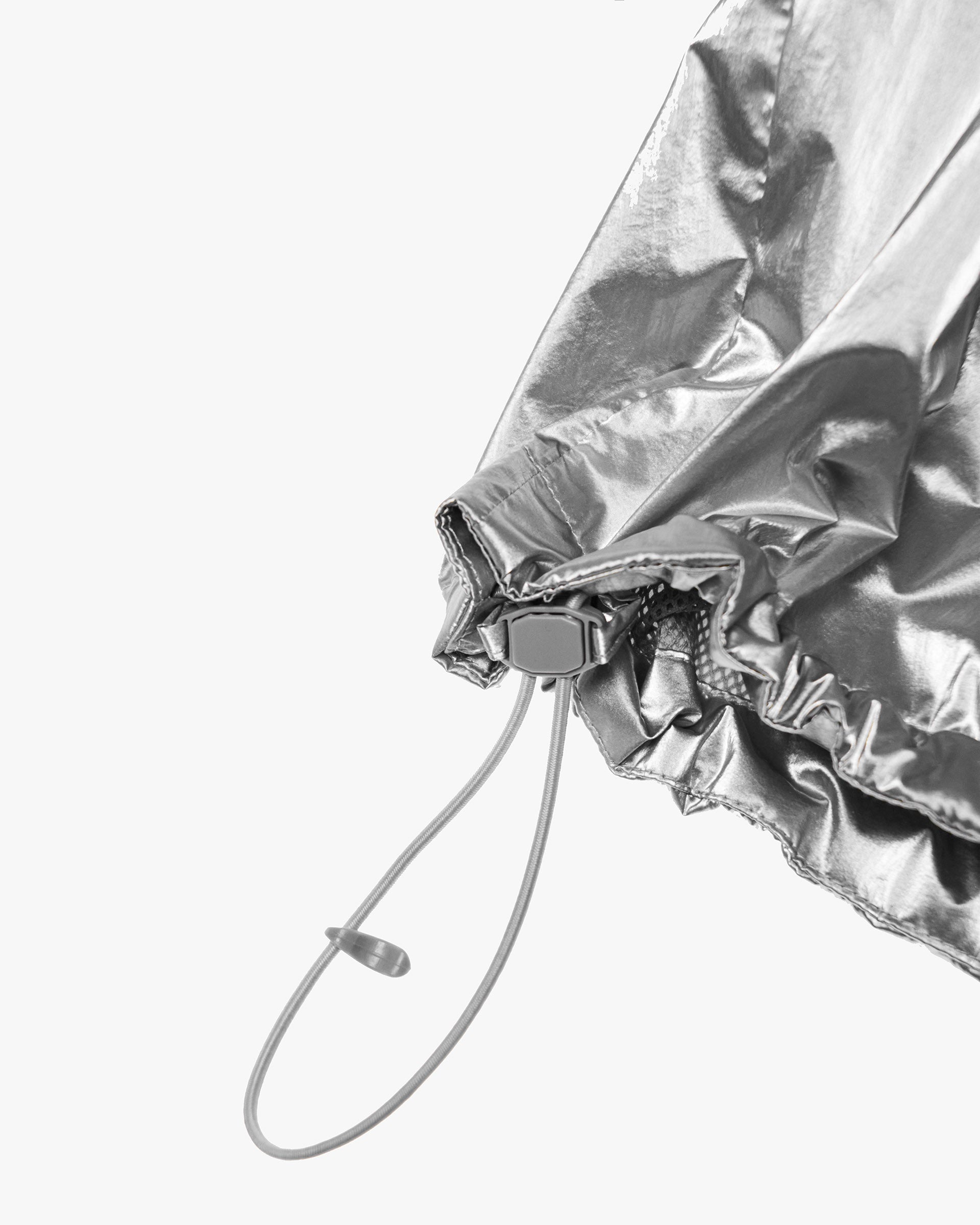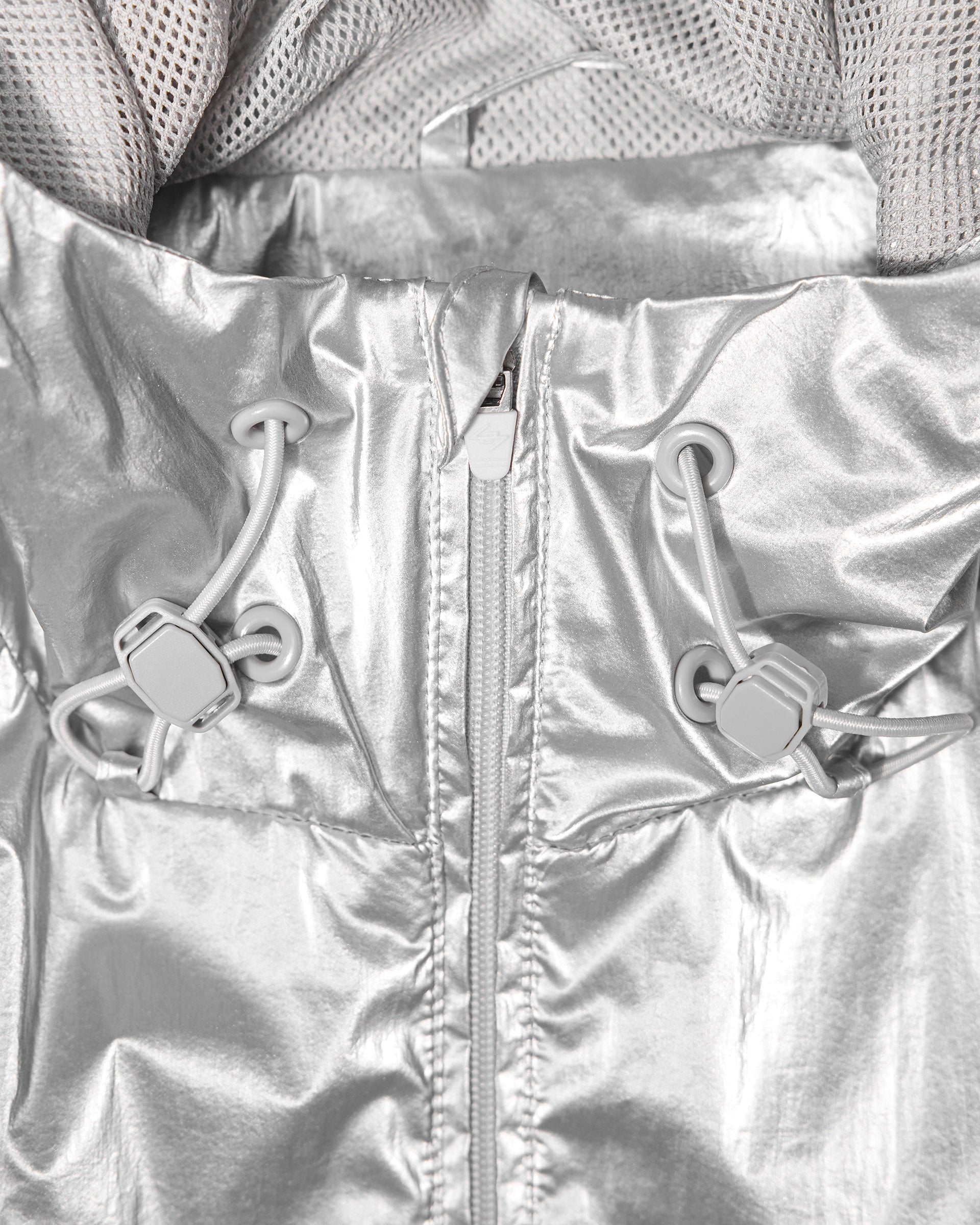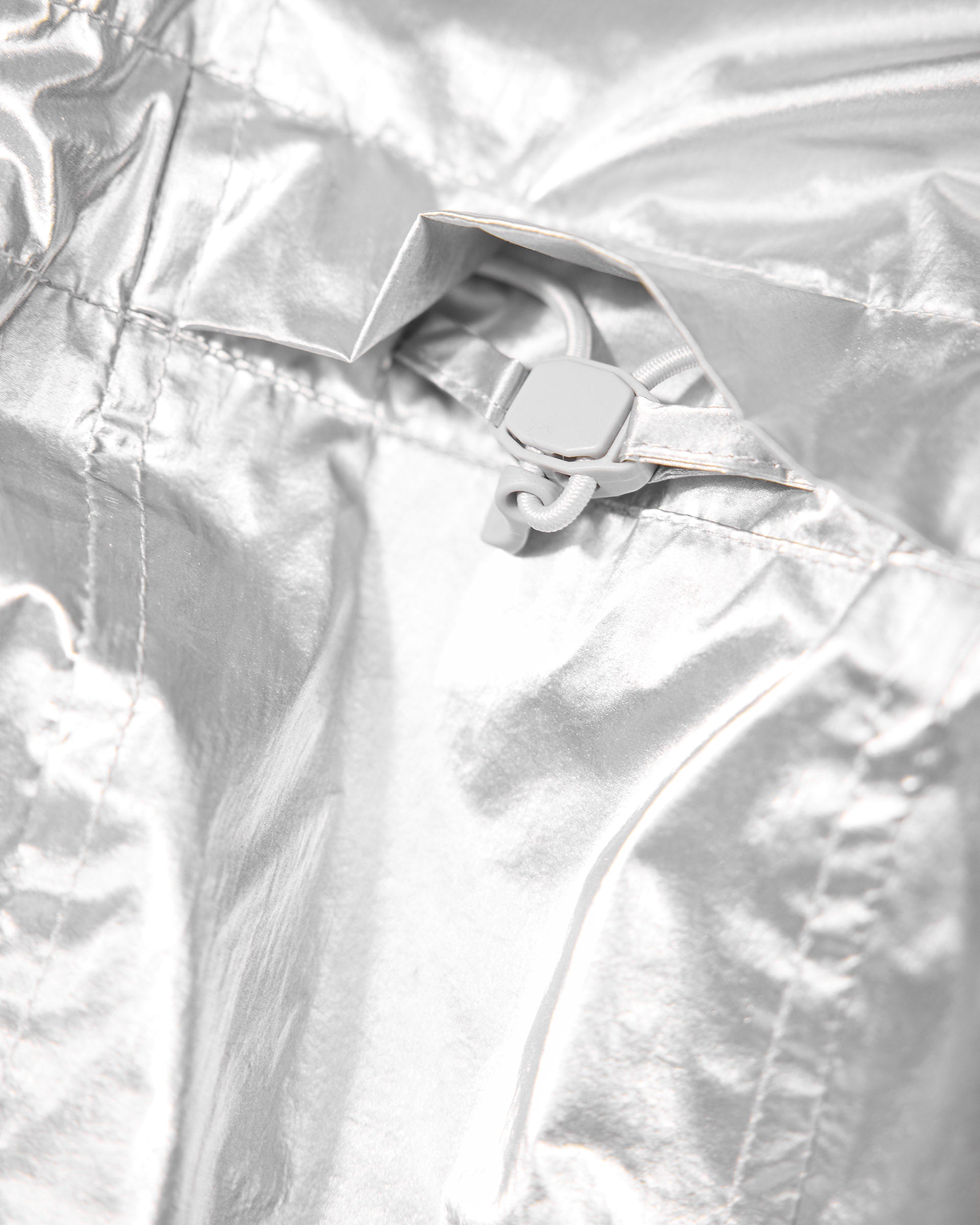 Introducing the 247 Foil Jacket in Silver. Built from PU coated foil fabric with a half mesh lining, this statement layer headlines the SS26 collection. Hood, neck and hem adjusters deliver a tailored fit, whilst front and back working storm flaps provide protection in variable conditions. Underarm eyelets offer ventilation when the pace picks up, with 3D peck construction and a mesh windproof insert completing the technical build.