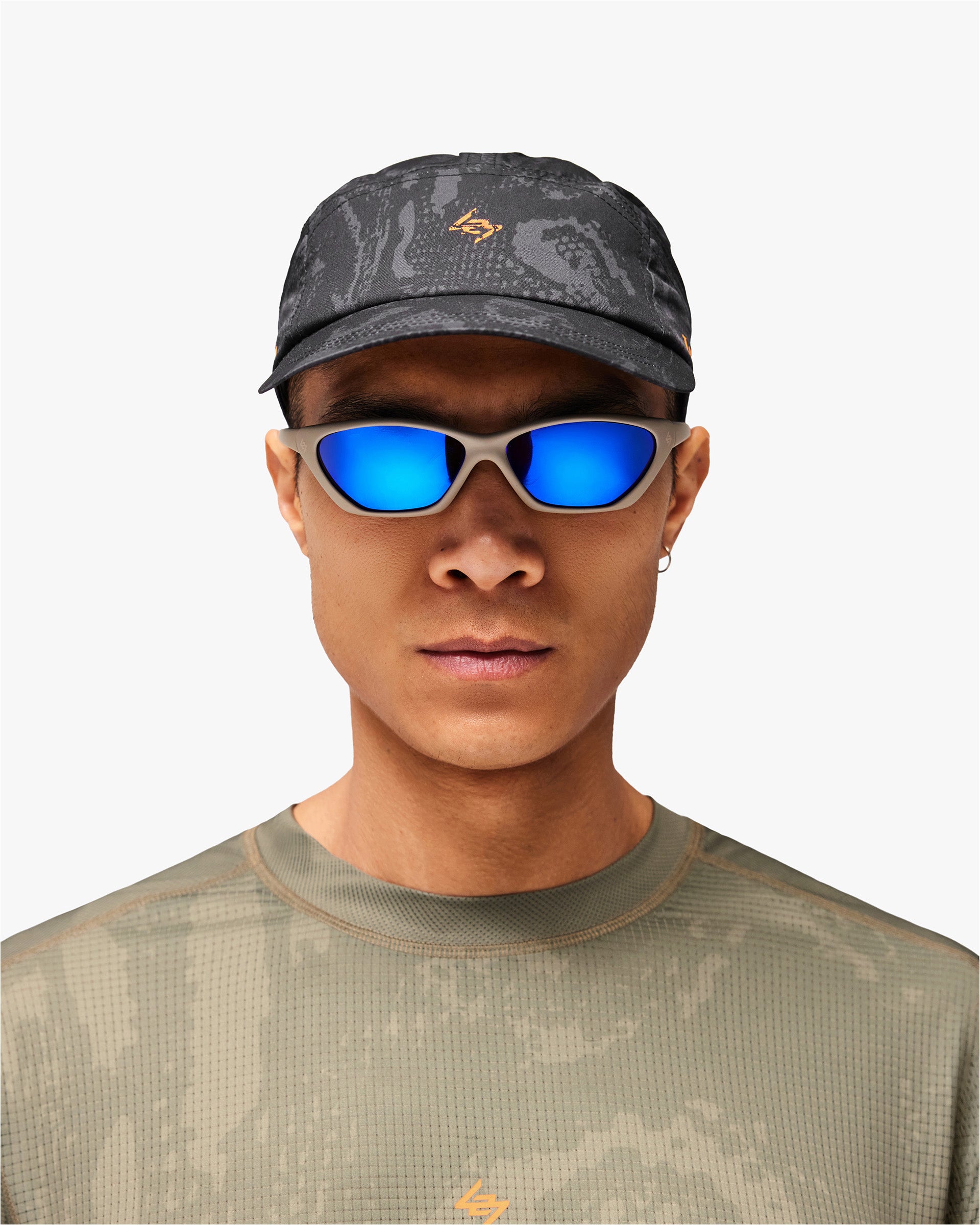 Introducing the 247 Los Angeles Cap. Engineered for distance running in warm conditions, this lightweight five-panel cap features perforated mesh side panels for enhanced airflow and a tonal printed shell for a refined, understated finish. Orange old English embroidery details nod to the collection's West Coast roots, finished with an adjustable rear toggle for a secure, locked-in fit.