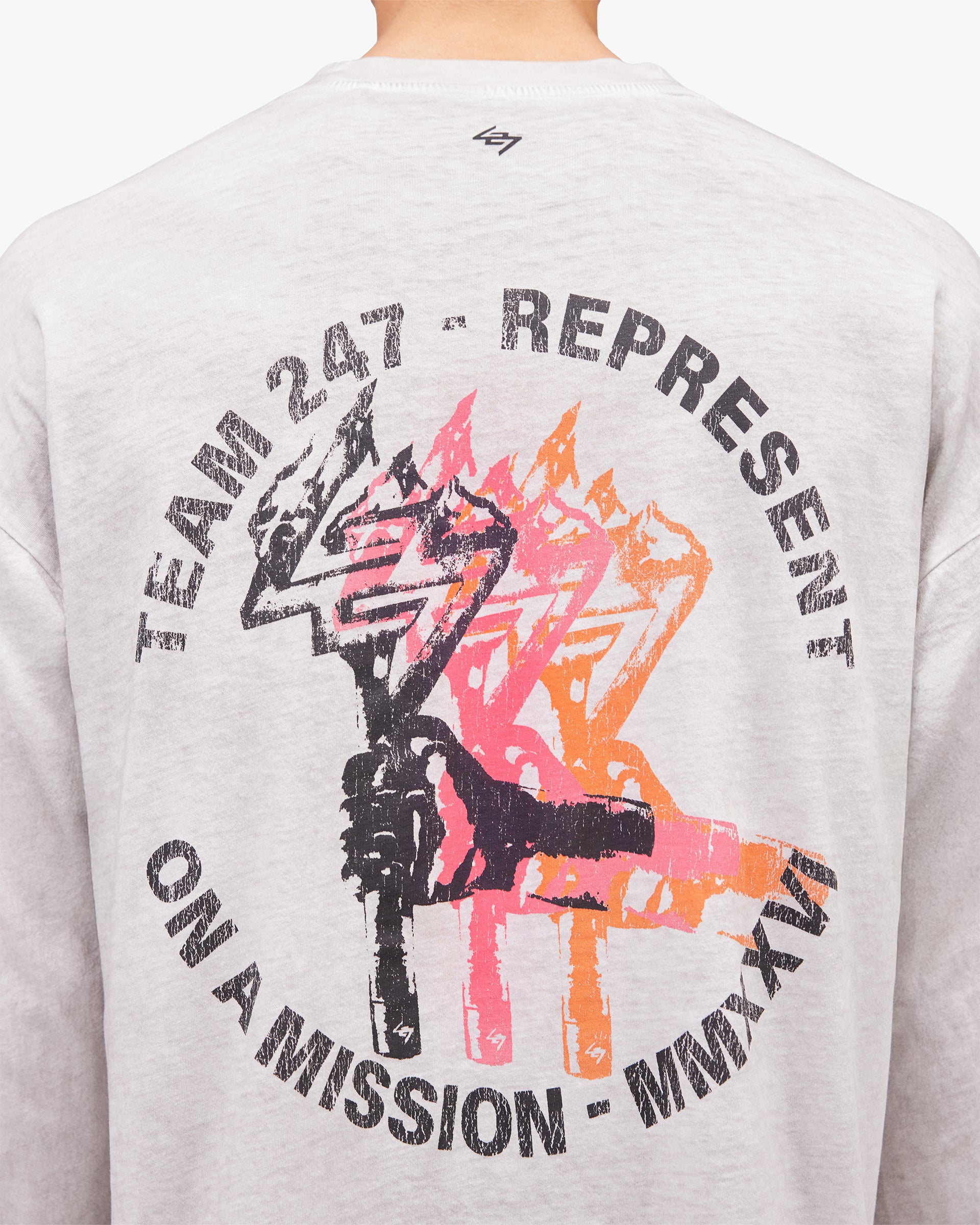 Introducing the 247 Torch Crop Long Sleeve in Bleach Wash. Cut in a boxy cropped fit from cotton slub fabric with a distressed bleach wash finish, the Torch collection references vintage athletics with a modern edge. The torch graphic pays homage to a golden era of American track and field, reimagined for the modern athlete.
