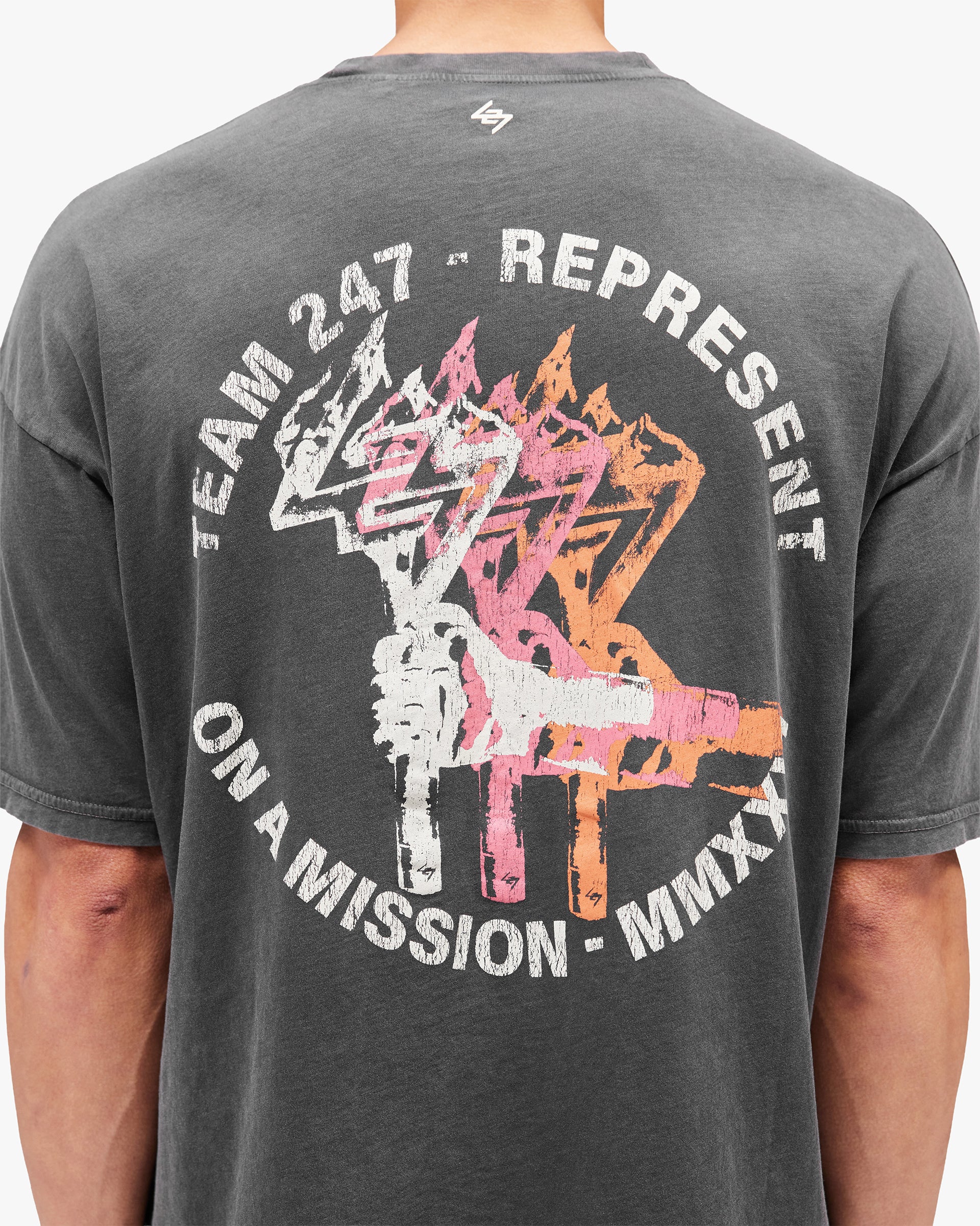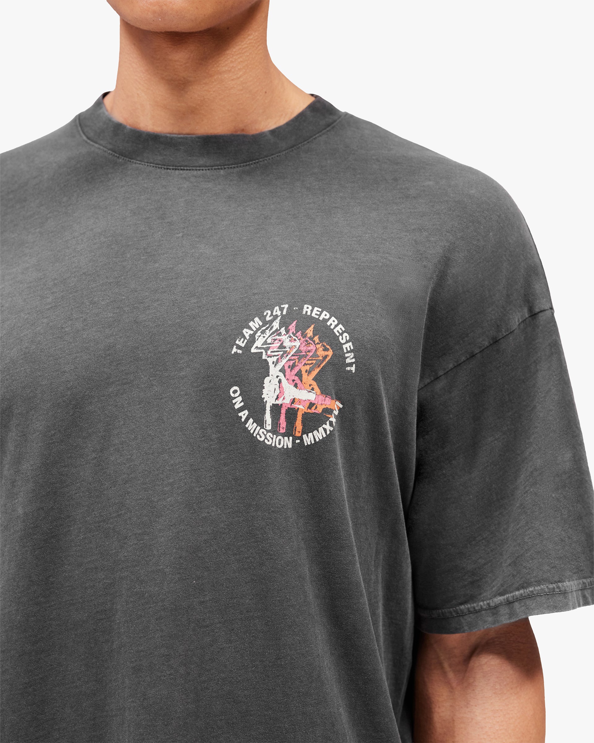 Introducing the 247 Torch Crop Tee in Washed Black. Cut in a boxy cropped fit from cotton slub fabric with a distressed wash finish, the Torch collection references vintage athletics with a modern edge. The torch graphic pays homage to a golden era of American track and field, reimagined for the modern athlete.