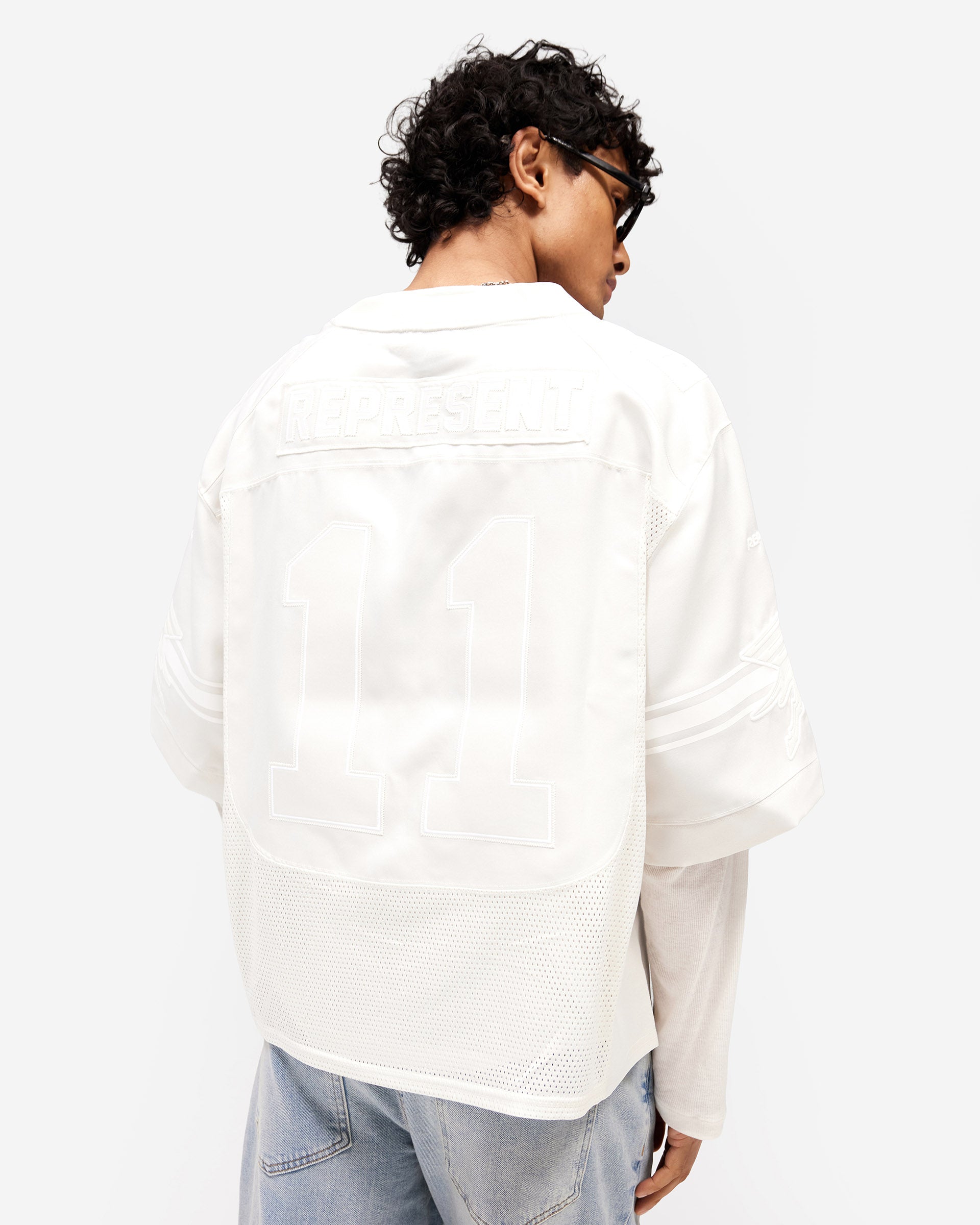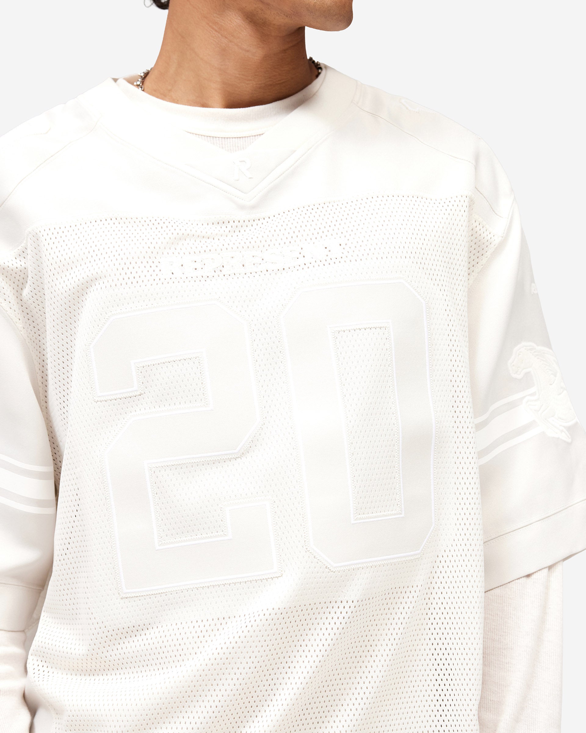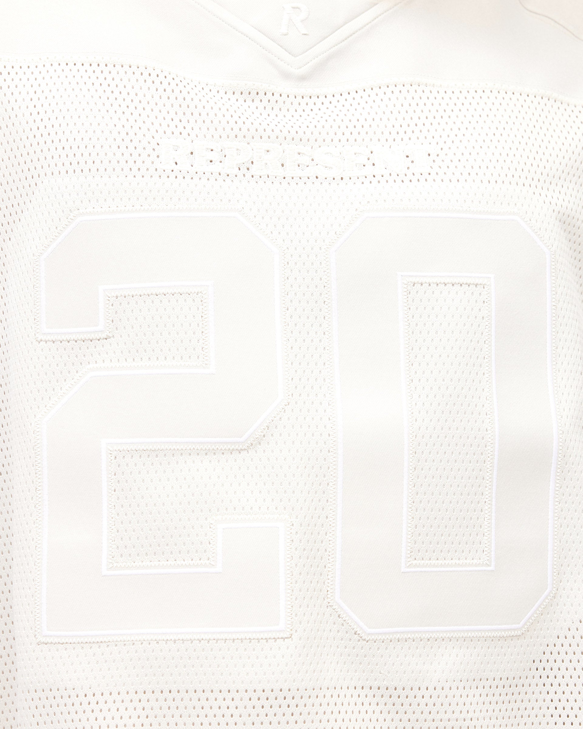 Introducing the American Football Top in Chalk, a piece that channels stadium energy and oversized sportswear aesthetics. This contemporary take on the classic American football jersey draws inspiration from the Drop 2 American Sport pillar, embracing the cropped, boxy silhouette and mesh construction that defines contemporary sport wear. A V-neck and wide sleeves create a distinctly modern silhouette whilst maintaining the athletic heritage of the original.