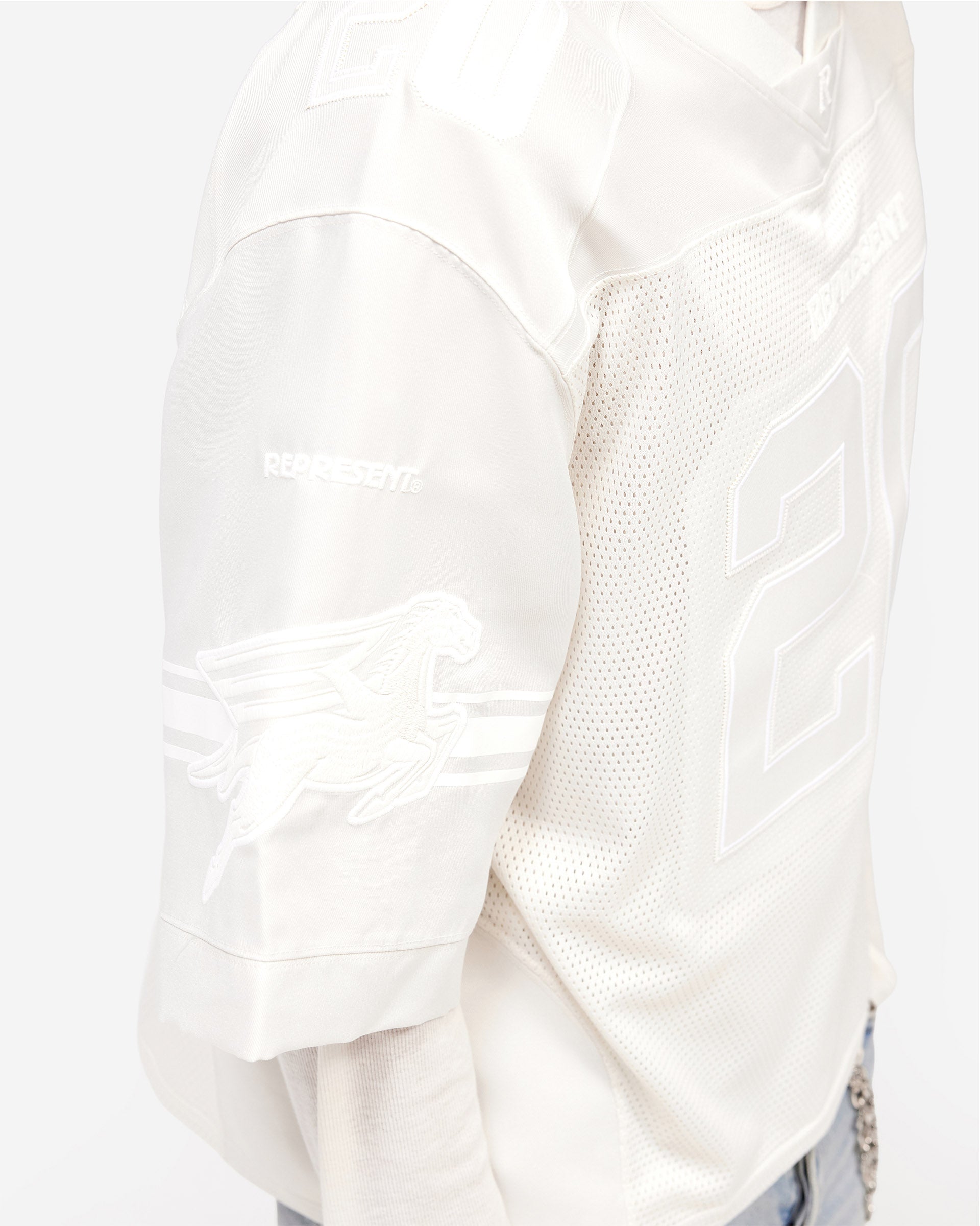 The construction blends multiple techniques. Twill fabric forms the base, contrasted with mesh panels that add visual dynamism and breathability. Graphics are applied in a trio of methods—applique, embroidery, and print—creating layered visual interest and textural depth. The result is a piece that reads as performance-inspired sportswear whilst maintaining the refined construction standards Represent applies across all categories. This is wearable nostalgia with contemporary purpose.