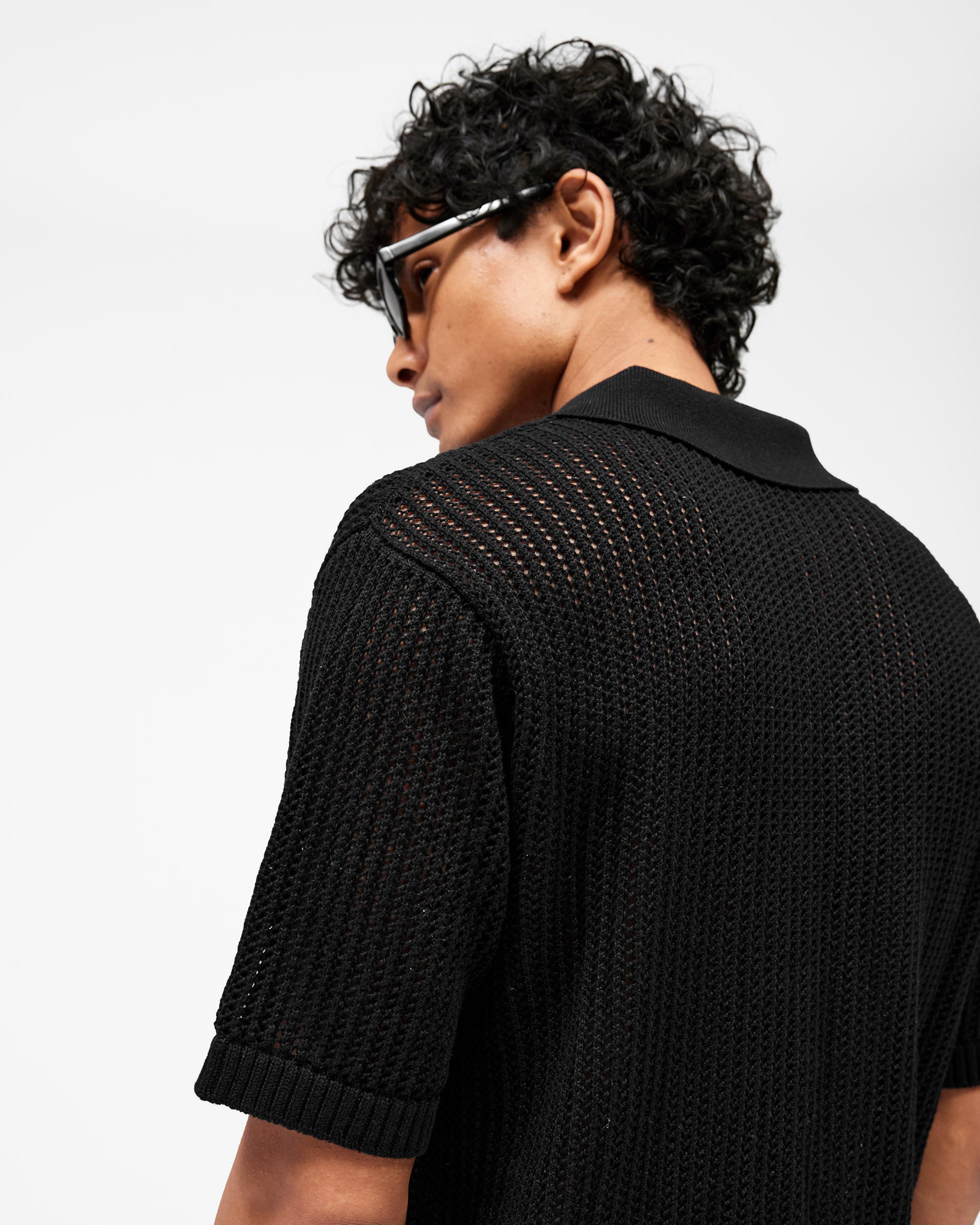 Introducing the Beverly Knit Polo in Jet Black, a refined knitwear essential built from open knit 7GG cotton. This piece arrives with considered detailing: a 1x1 rib knit collar with collar stand, a branded metal bar at the hem, 2x1 rib hem and cuffs, and side splits for ease of movement. The fully linked seams speak to construction integrity, making this a piece designed for longevity.