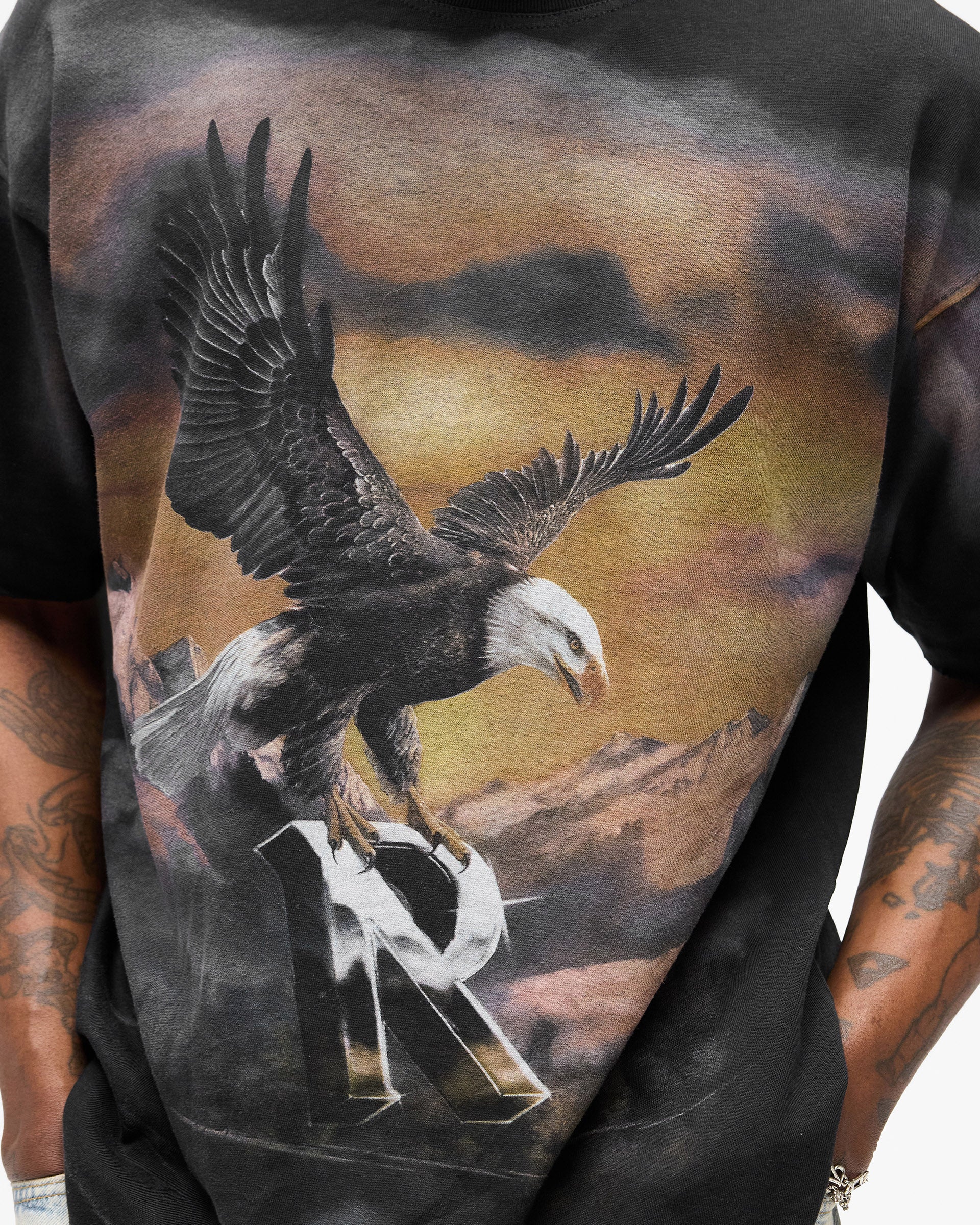 Introducing the Chrome Flight T-Shirt in Stained Black, an oversized t-shirt crafted from heavyweight cotton jersey with a lived-in stained finish. A large-scale eagle graphic spans the front, set against a mountain landscape with the Represent initial worked into the rock face below.