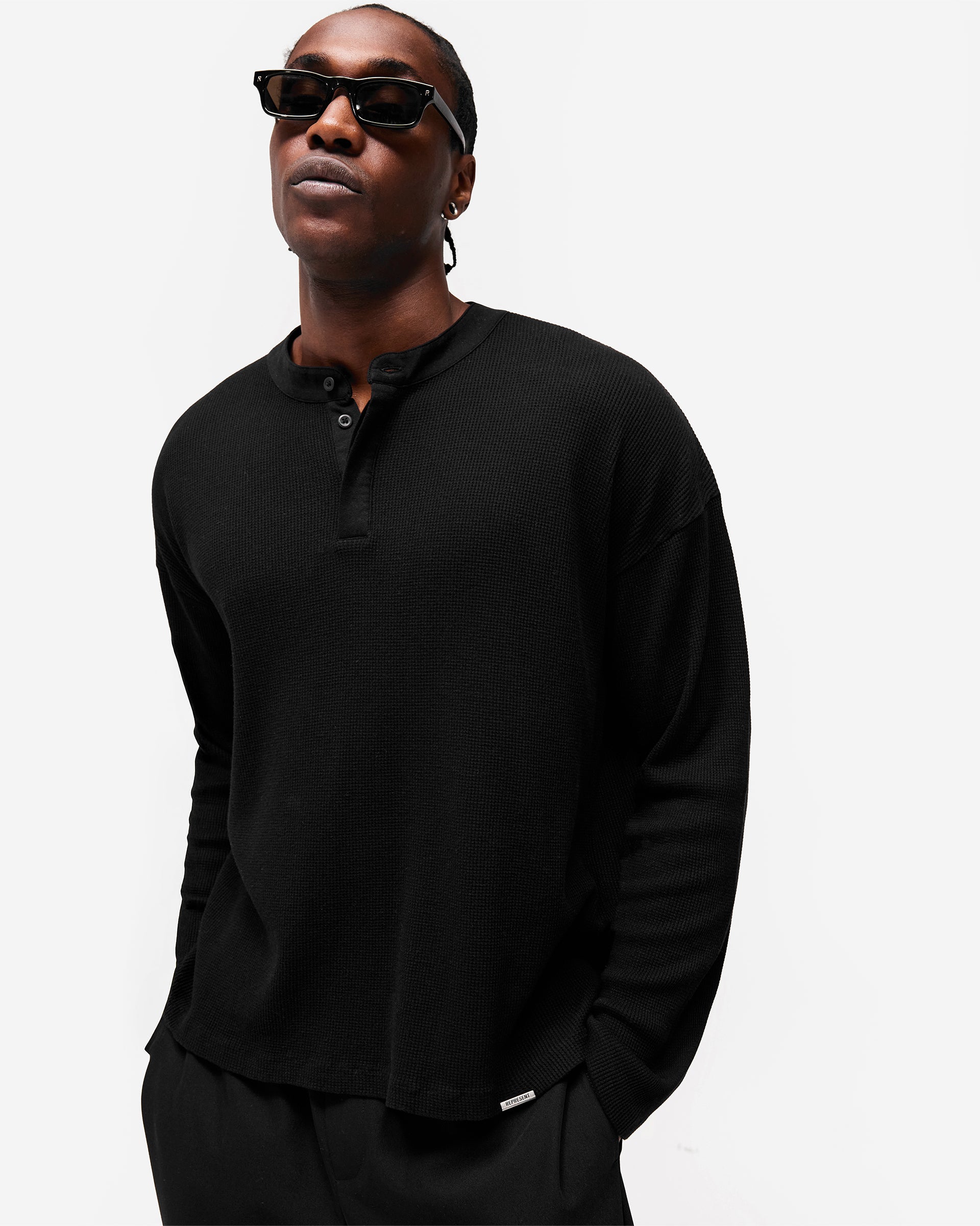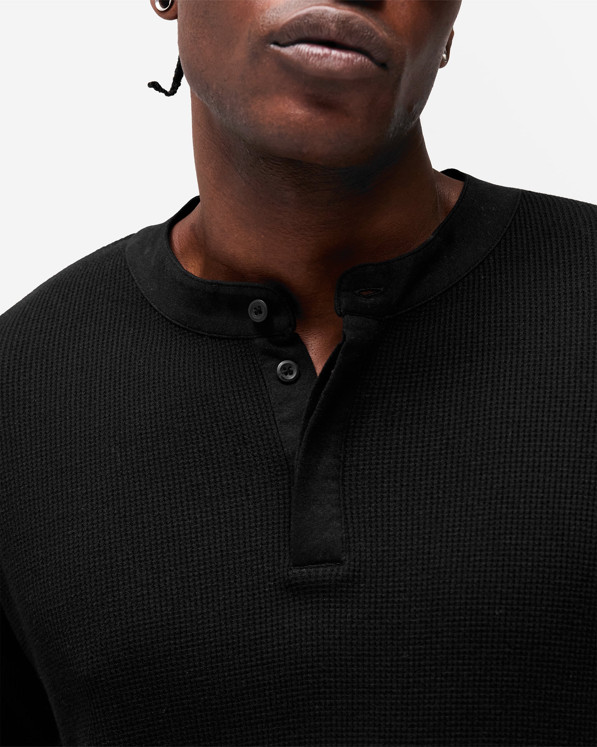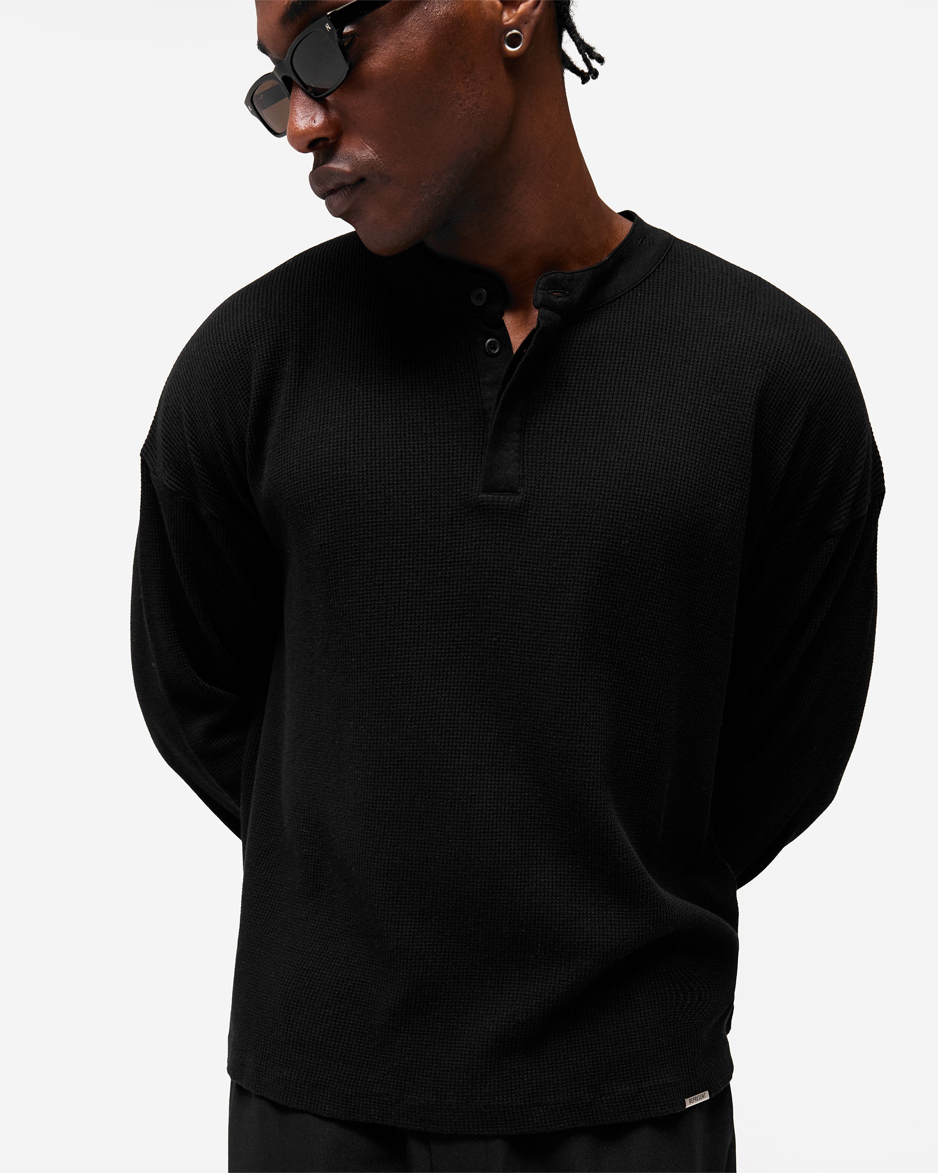 Introducing the Initial Henley Waffle Long Sleeve T-Shirt in Jet Black, a long sleeve silhouette crafted from 175gsm waffle jersey cotton. The textured waffle knit delivers a distinctive surface with natural depth, while the grandad collar with one exposed and three concealed buttons adds a refined, heritage-inspired neckline.