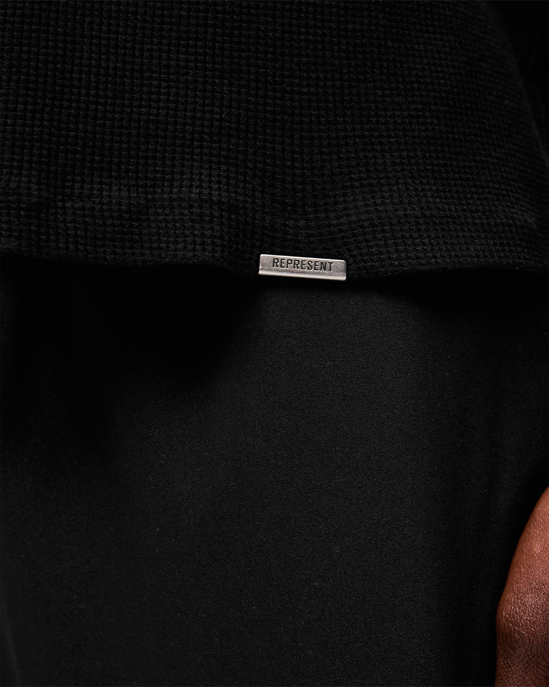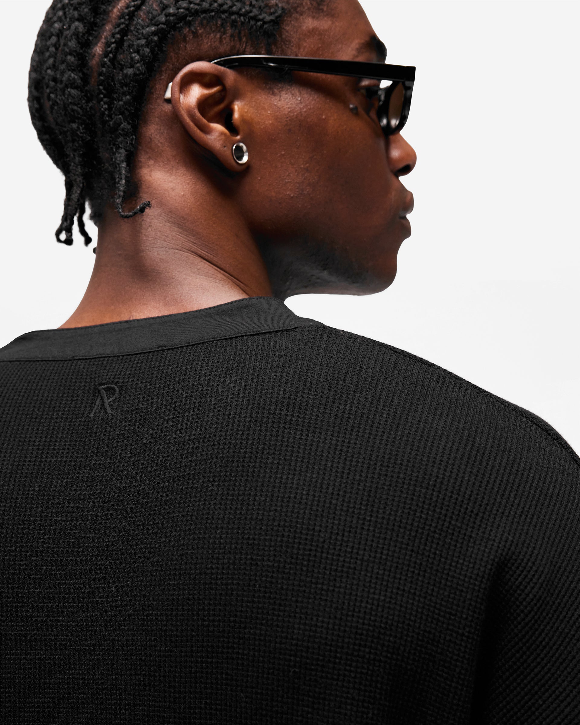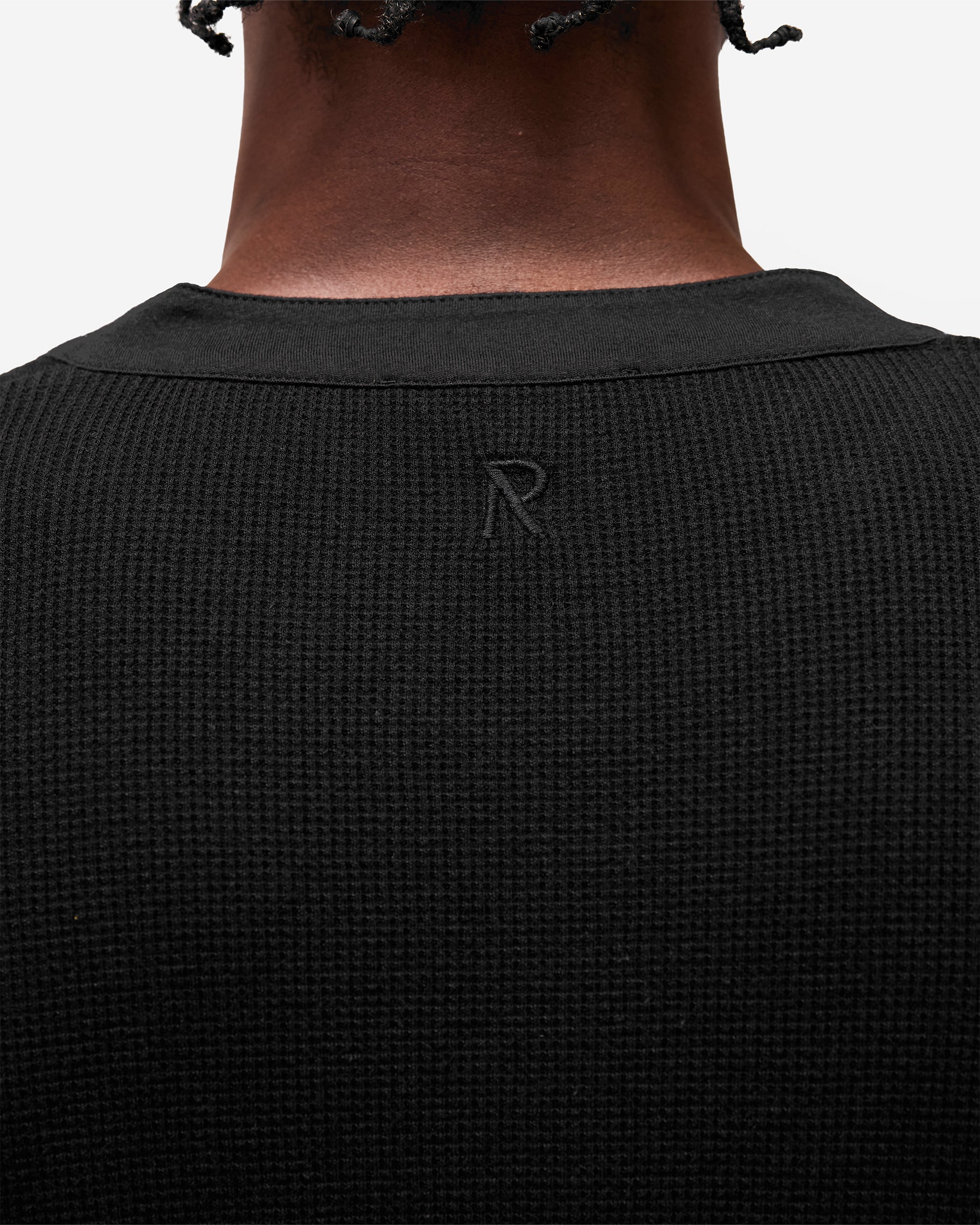 Introducing the Initial Henley Waffle Long Sleeve T-Shirt in Jet Black, a long sleeve silhouette crafted from 175gsm waffle jersey cotton. The textured waffle knit delivers a distinctive surface with natural depth, while the grandad collar with one exposed and three concealed buttons adds a refined, heritage-inspired neckline.