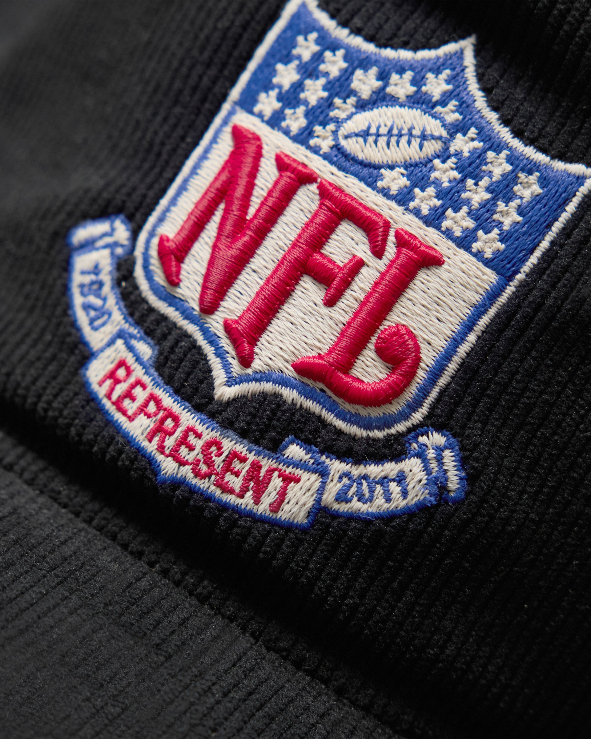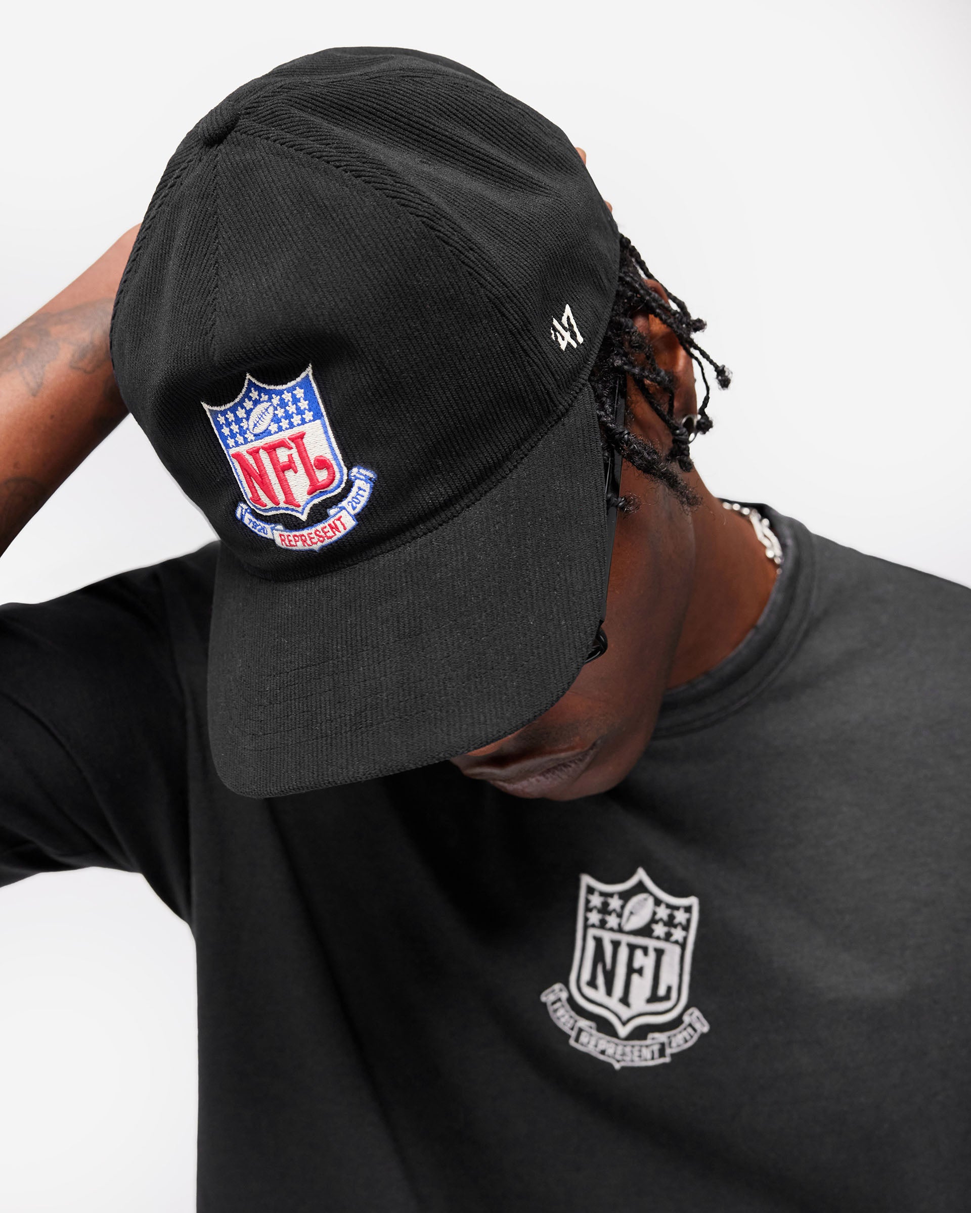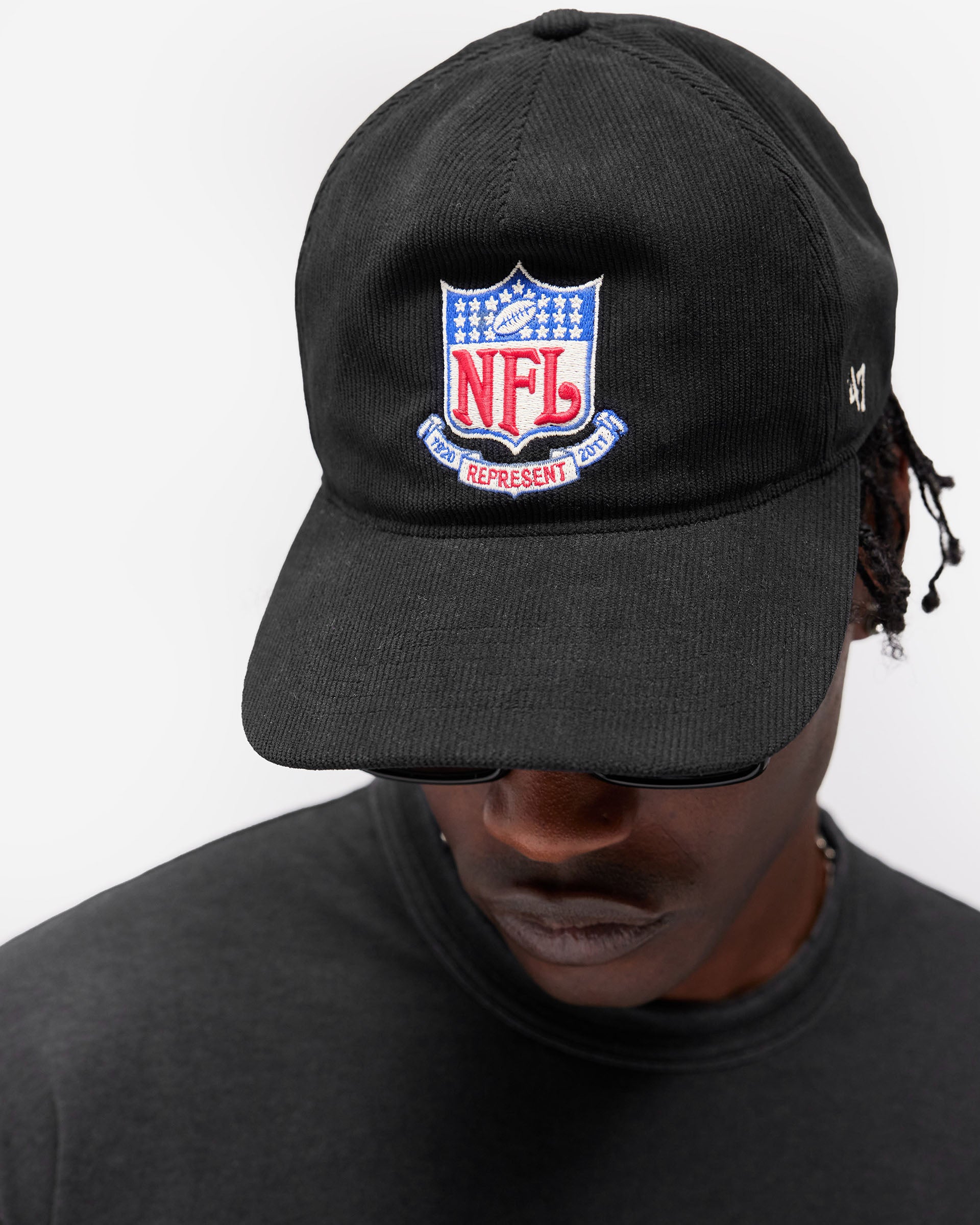 Introducing the NFL Shield x Represent x '47 Cap in Jet Black, part of Represent's first collaboration with the NFL, in partnership with Fanatics. Built on '47's Hitch five-panel silhouette in black cord fabric, this cap features high-build mixed stitch embroidery of the NFL Shield logo with Represent branding integrated into the Shield design. A '47 logo sits to the left-hand side with a Represent initial badge to the right. Stitched eyelets to the crown provide ventilation, finished with a plastic snapback closure for an adjustable fit.