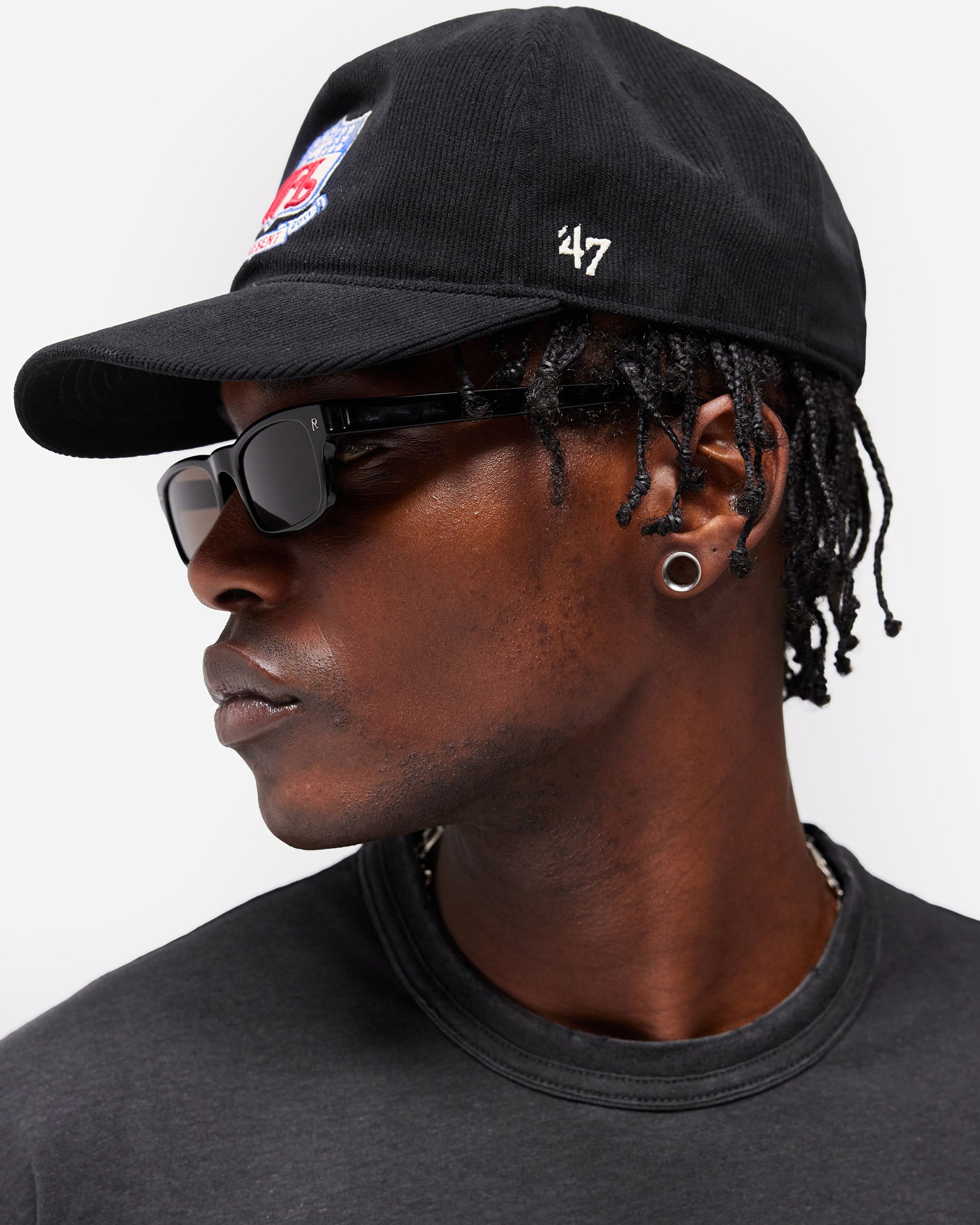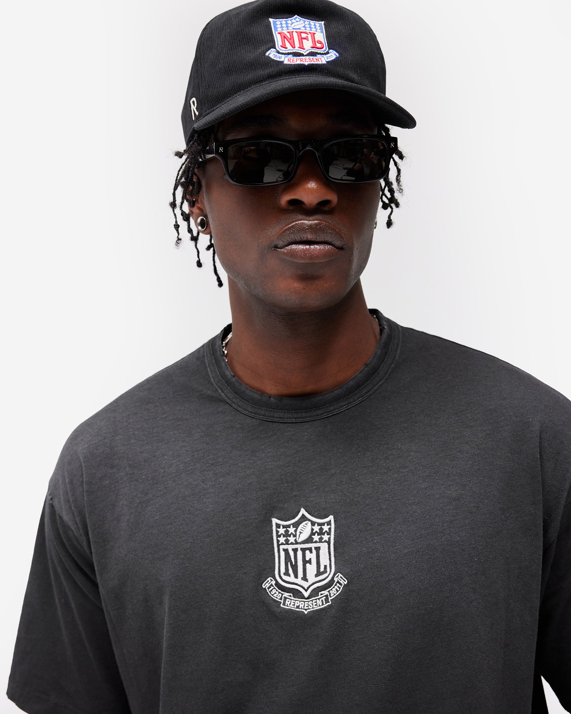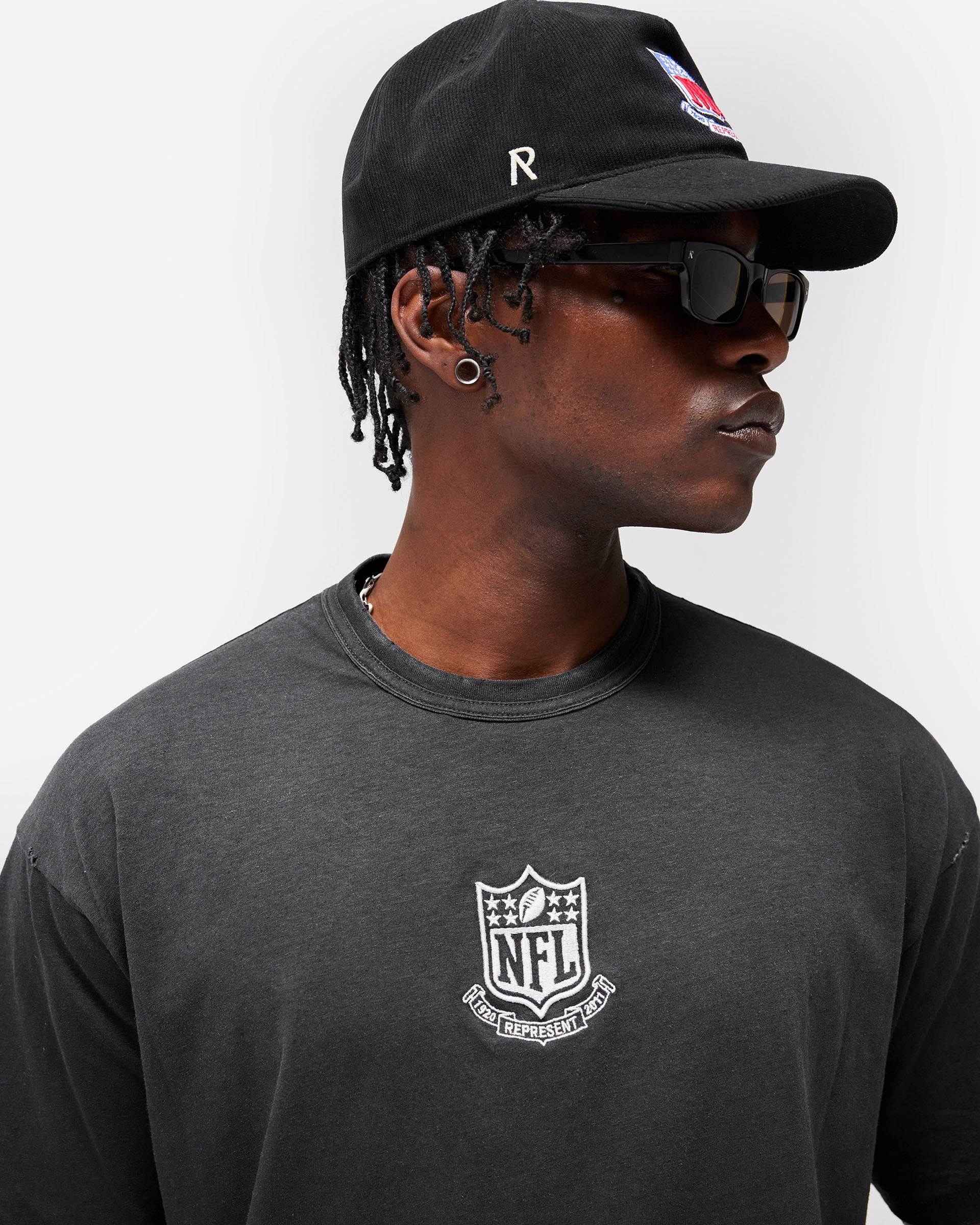 Introducing the NFL Shield x Represent x '47 Cap in Jet Black, part of Represent's first collaboration with the NFL, in partnership with Fanatics. Built on '47's Hitch five-panel silhouette in black cord fabric, this cap features high-build mixed stitch embroidery of the NFL Shield logo with Represent branding integrated into the Shield design. A '47 logo sits to the left-hand side with a Represent initial badge to the right. Stitched eyelets to the crown provide ventilation, finished with a plastic snapback closure for an adjustable fit.