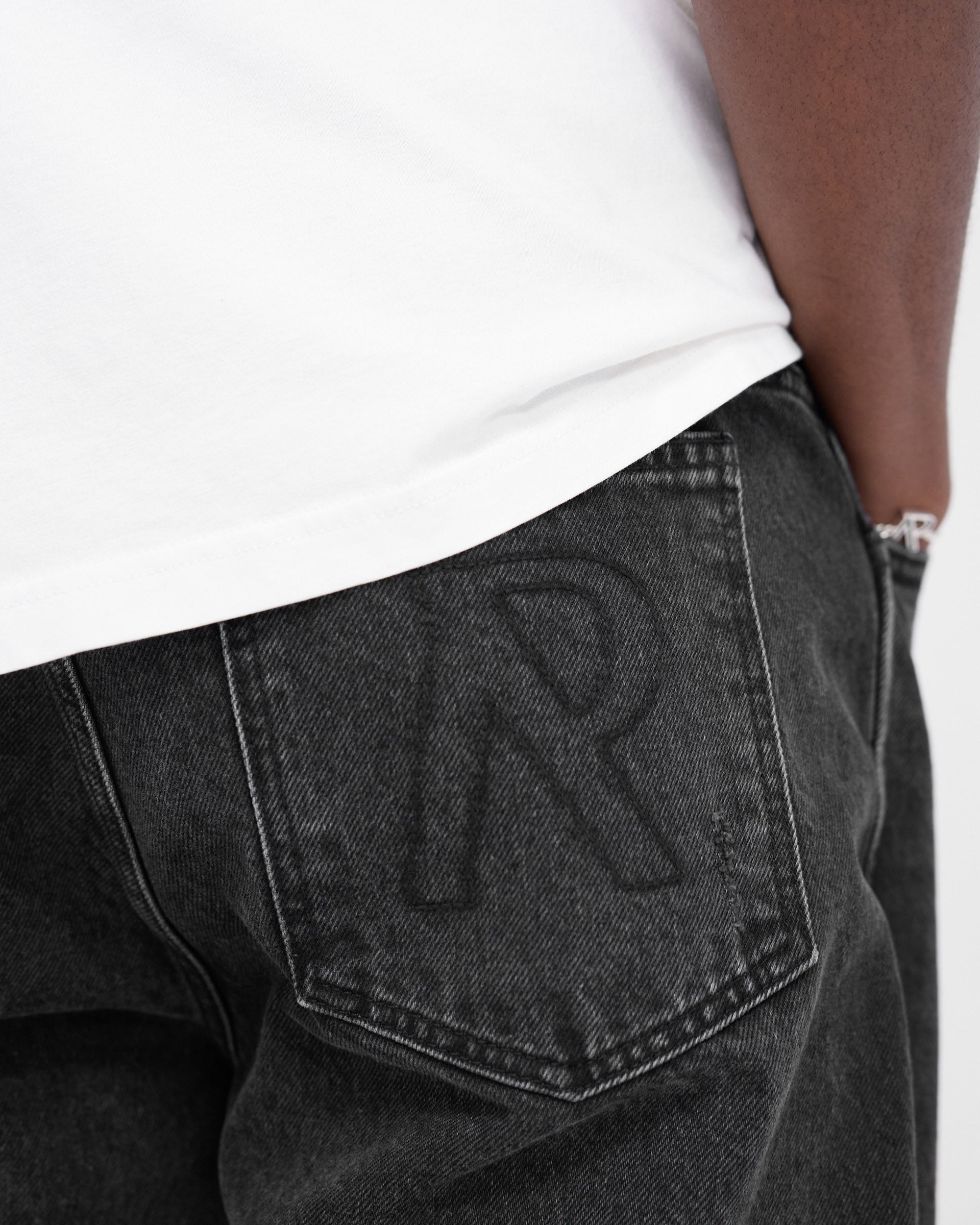 Introducing the R2 Straight Leg Denim in Black, a pair of straight leg jeans with an embroidered Initial to the back pocket, branded Initial button and Represent metal bar to the belt loop.