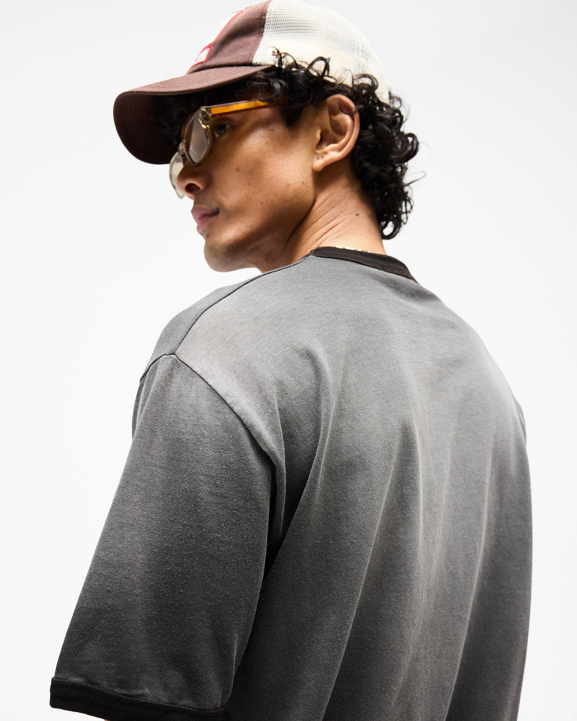 Construction details matter. A signature metal bar anchors the hem, whilst ribbed cuffs and hem provide definition. Crafted from 100% cotton slub at 230GSM, the fabric has weight and texture that develops character with wear. The slub weave creates subtle dimensionality, and the natural fading process means this piece becomes more distinctive over time. The ringer silhouette is timeless, designed to sit close to the body in a traditional regular fit.